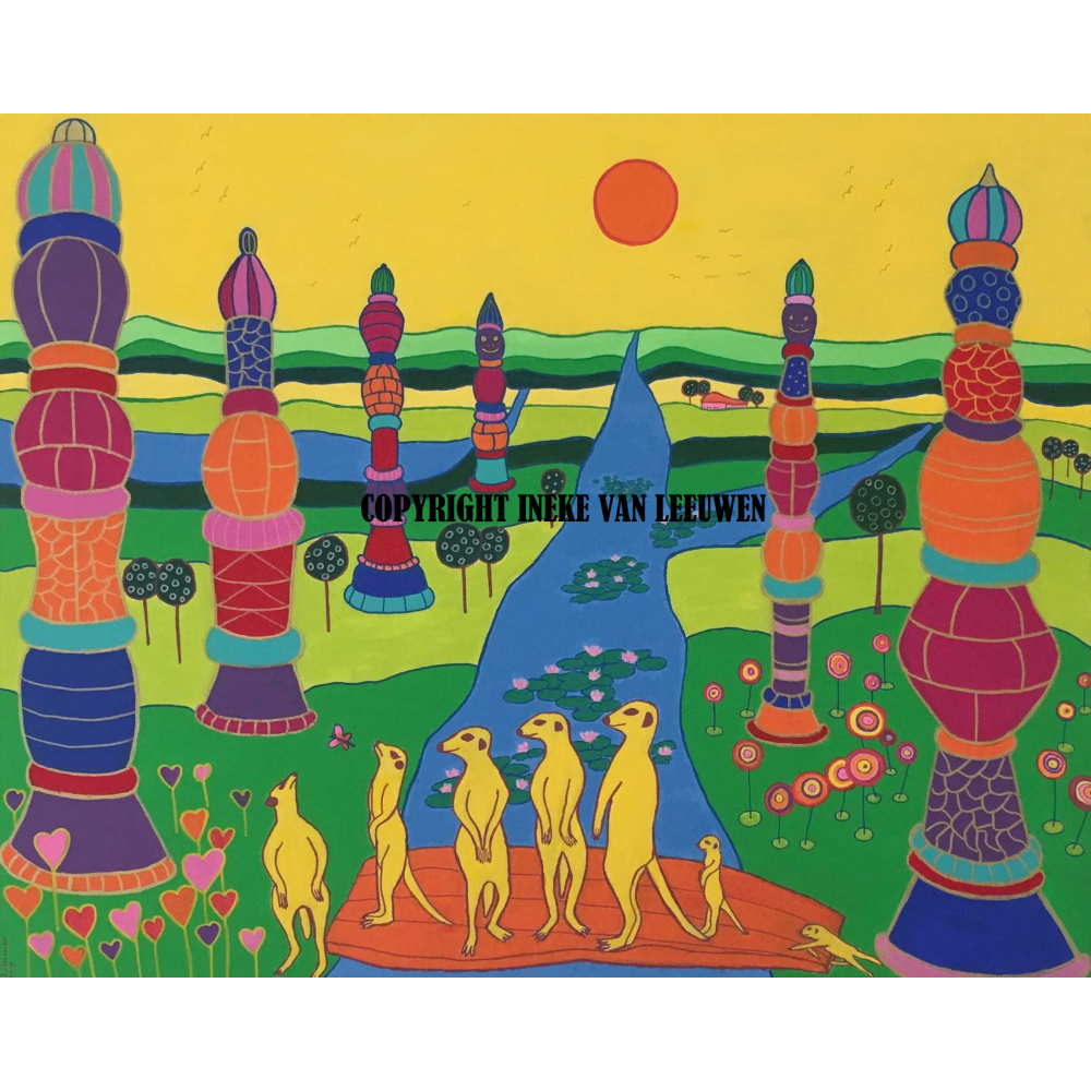 Stokstaartjes aan de wandel, acryl, 80 bij 100 cm