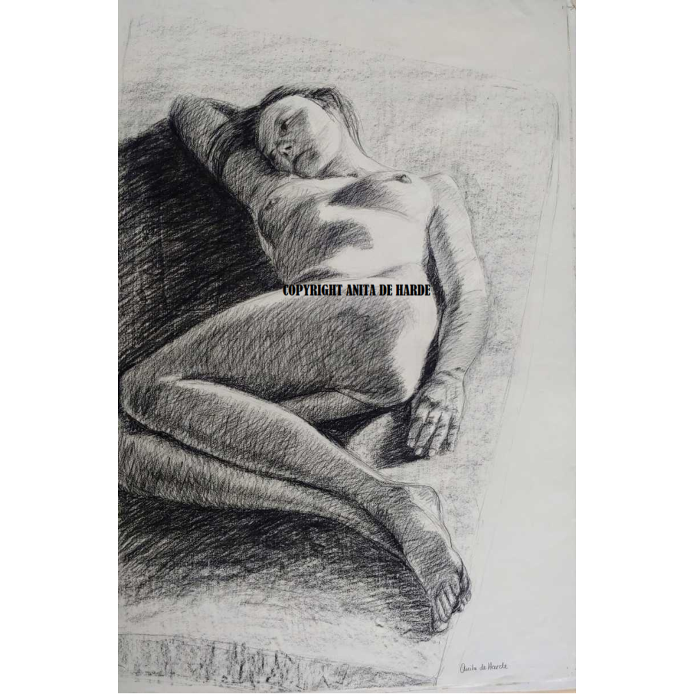 Vrouw liggend naakt, potlood op papier, 65 x 100 cm